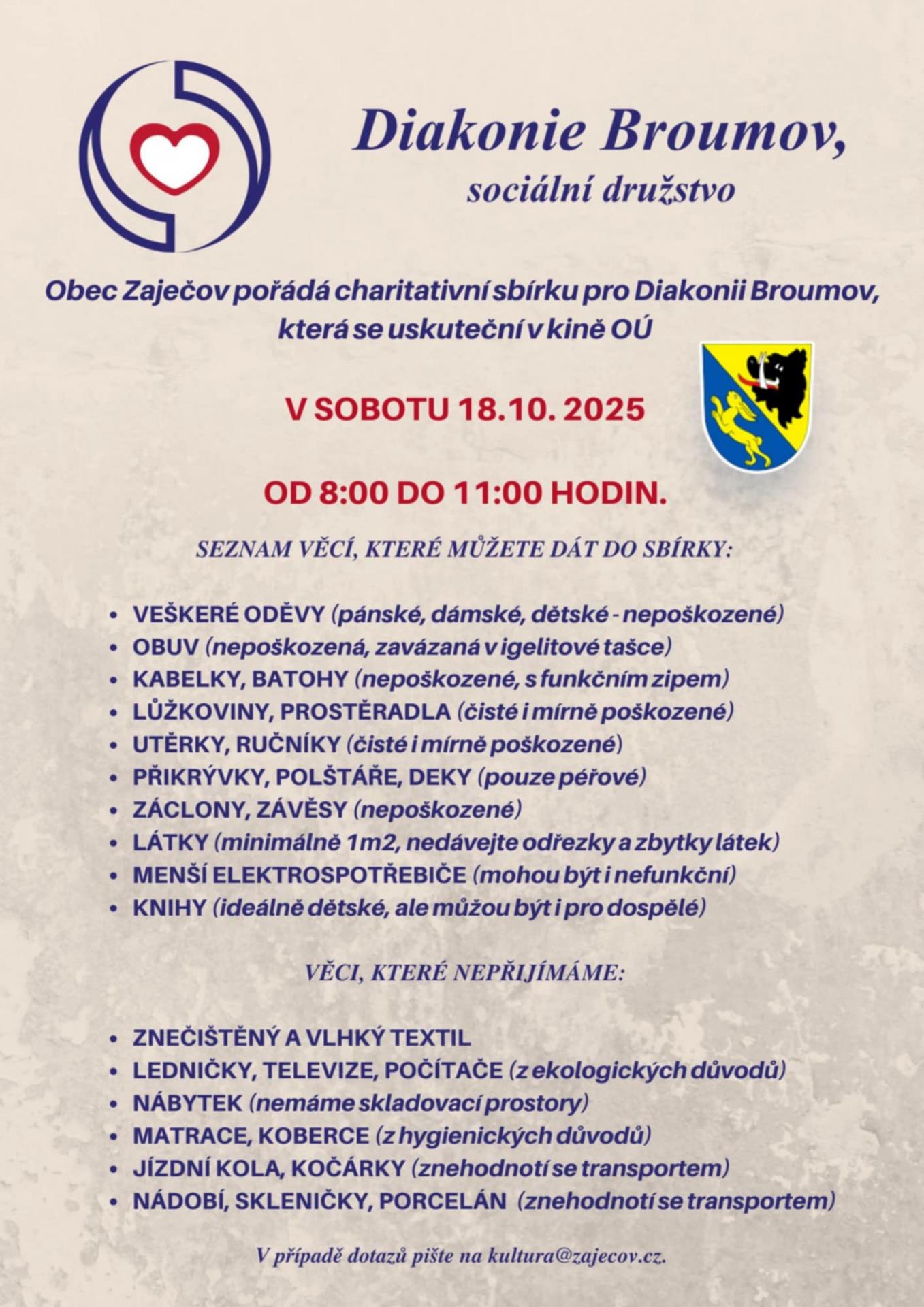 Obec Zaječov pořádá charitativní sbírku pro Diakonii Broumov, která se uskuteční 18.10.2025 od 8-11 h v kině Zaječov. Seznam věcí, které můžete do sbírky dát naleznete na přiloženém letáku.