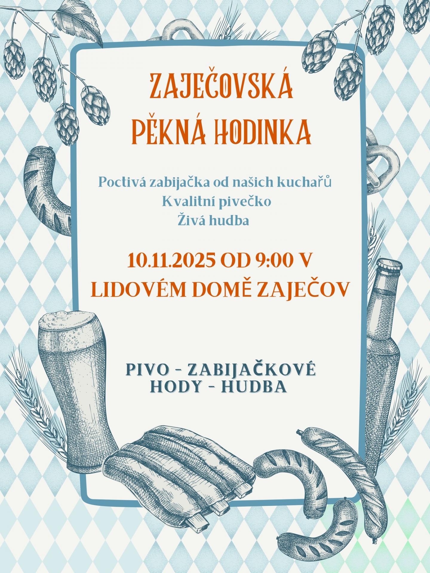 Lidový dům Zaječov všechny srdečně zveme na Pěknou hodinku do Lidového domu a to 10.11.2025 od 9:00 h. Těšit se můžete na živou hudbu, dobré jídlo a pití.