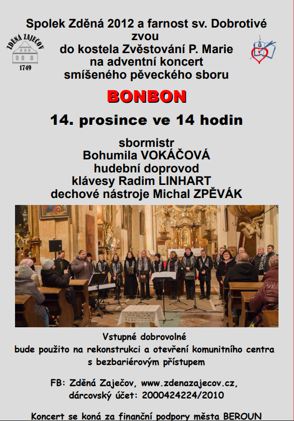 Spolek Zděná 2012 a farnost sv. Dobrotivé všechny srdečně zvou na adventní koncert smíšeného pěveckého sboru Bonbon. Koncert se uskuteční v kostele ZVĚSTOVÁNÍ PANNY MARIE dne 14.12.2025 od 14 h. Vstupné dobrovolné. Více se dozvíte na přiloženém letáku.