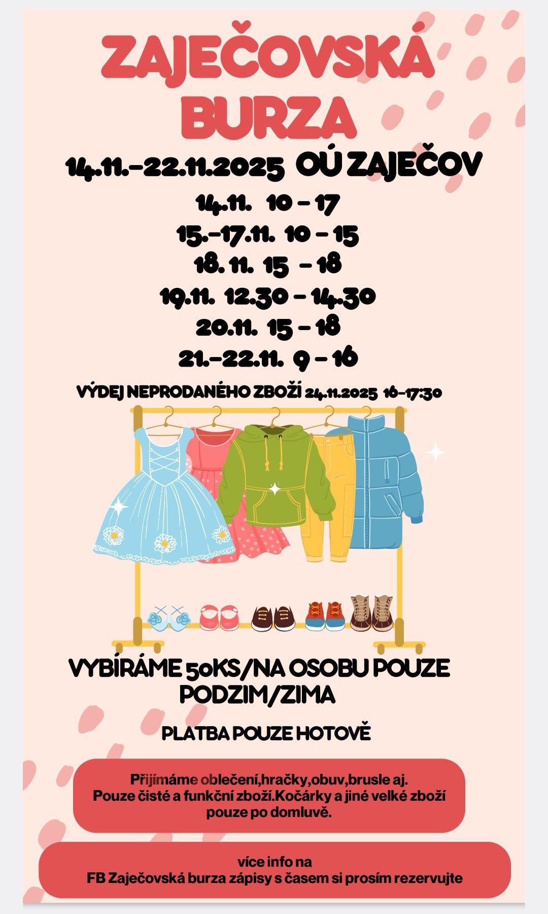 První zaječovská burza. Přijďte si levně nakoupit oblečení, hračky atd.... Budeme se na Vás těšit v prostorách OÚ Zaječov.