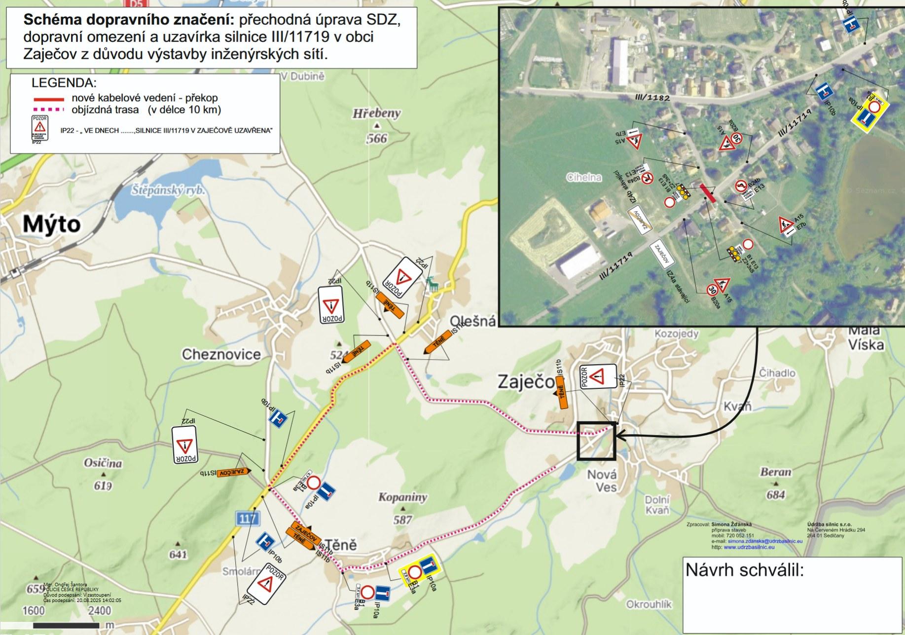 Úplná uzavírka silnice III/11719 v obci Zaječov bude od 22. 9. 2025 do 26. 9. 2025. Objízdná trasa je vedena od křižovatky silnic III/11719 a III/1182 dále po silnici III/1182 z obce Zaječov směrem ke křižovatce se silnicí II/117 u Olešné a dále po silnici II/117 směrem ke křižovatce se silnicí III/11719 vedoucí přes obec Těně a pokračuje na začátek Zaječova. Objízdná trasa je obousměrná. Pro pěší se nic nemění.
