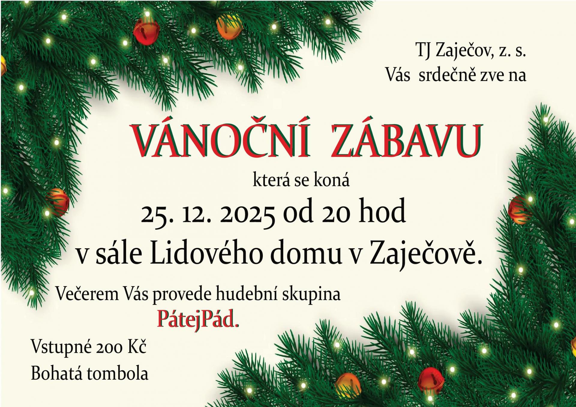 TJ Zaječov, z. s. všechny srdečně zve na VÁNOČNÍ ZÁBAVU, která proběhne 25.12.2025 od 20 h v sále LD Zaječov. Těšit se můžete na hudební skupinu PátejPád a bohatou tombolu.