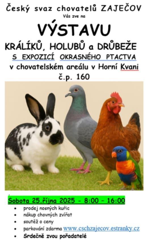 Český svaz chovatelů všechny srdečně zve 25.10.2025 od 8:00 - 16:00 h do chovatelského areálu v Horní Kvani na výstavu králíků, holubů, drůbeže a exotického ptactva.
